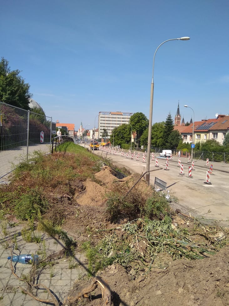 Budowa linii tramwajowej w alei Piłsudskiego, w okolicach skrzyżowania z ulicą Narutowicza (13 sierpnia 2021) © OlsztyńskieTramwaje.pl