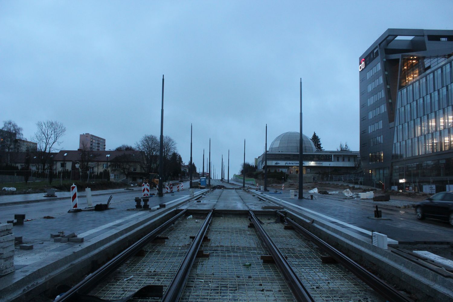 Budowa linii tramwajowej w alei Piłsudskiego, w pobliżu przystanku Planetarium (15 stycznia 2023) © OlsztyńskieTramwaje.pl