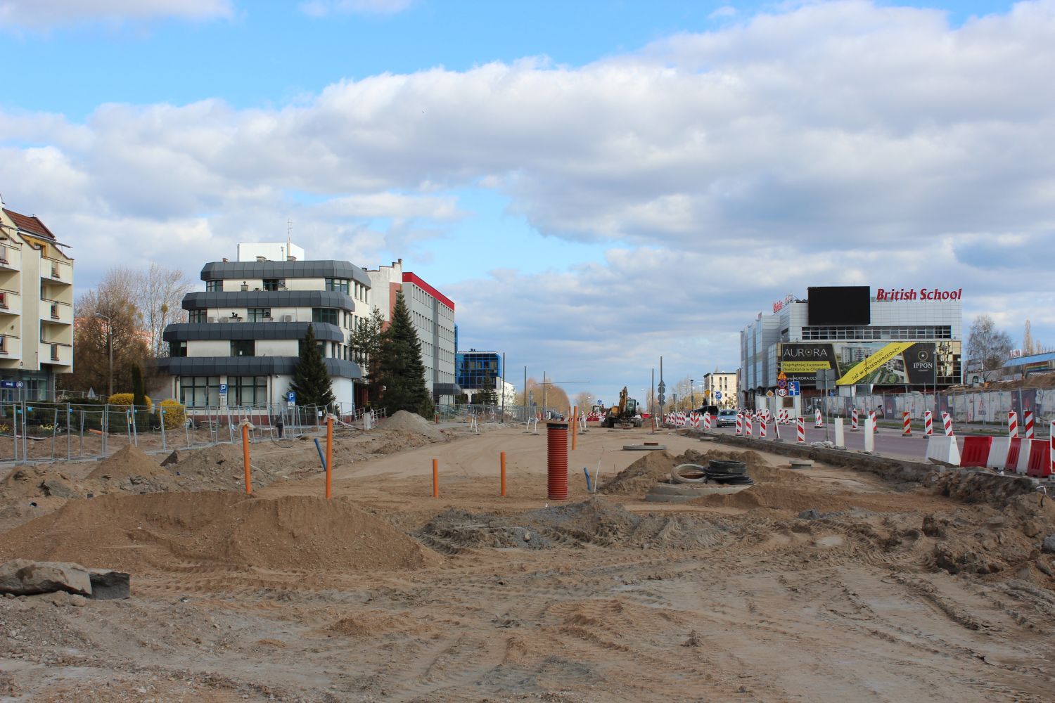 Budowa linii tramwajowej w alei Piłsudskiego, w pobliżu remontowanej hali Urania (16 kwietnia 2022) © OlsztyńskieTramwaje.pl