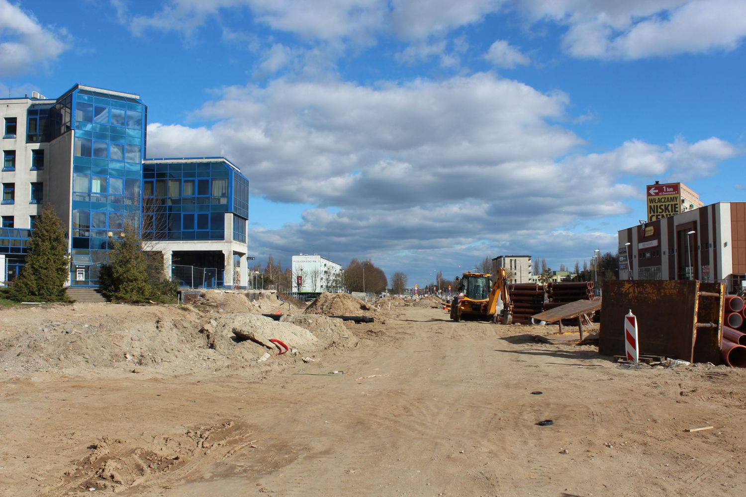 Budowa linii tramwajowej w alei Piłsudskiego, w pobliżu remontowanej hali Urania (16 kwietnia 2022) © OlsztyńskieTramwaje.pl
