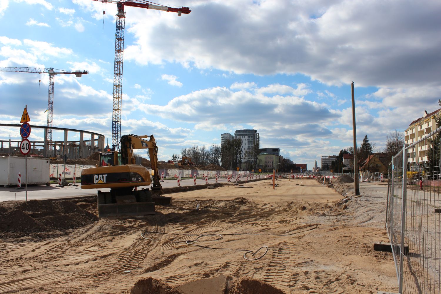 Budowa linii tramwajowej w alei Piłsudskiego, w pobliżu remontowanej hali Urania – po lewej widoczny jej szkielet (16 kwietnia 2022) © OlsztyńskieTramwaje.pl