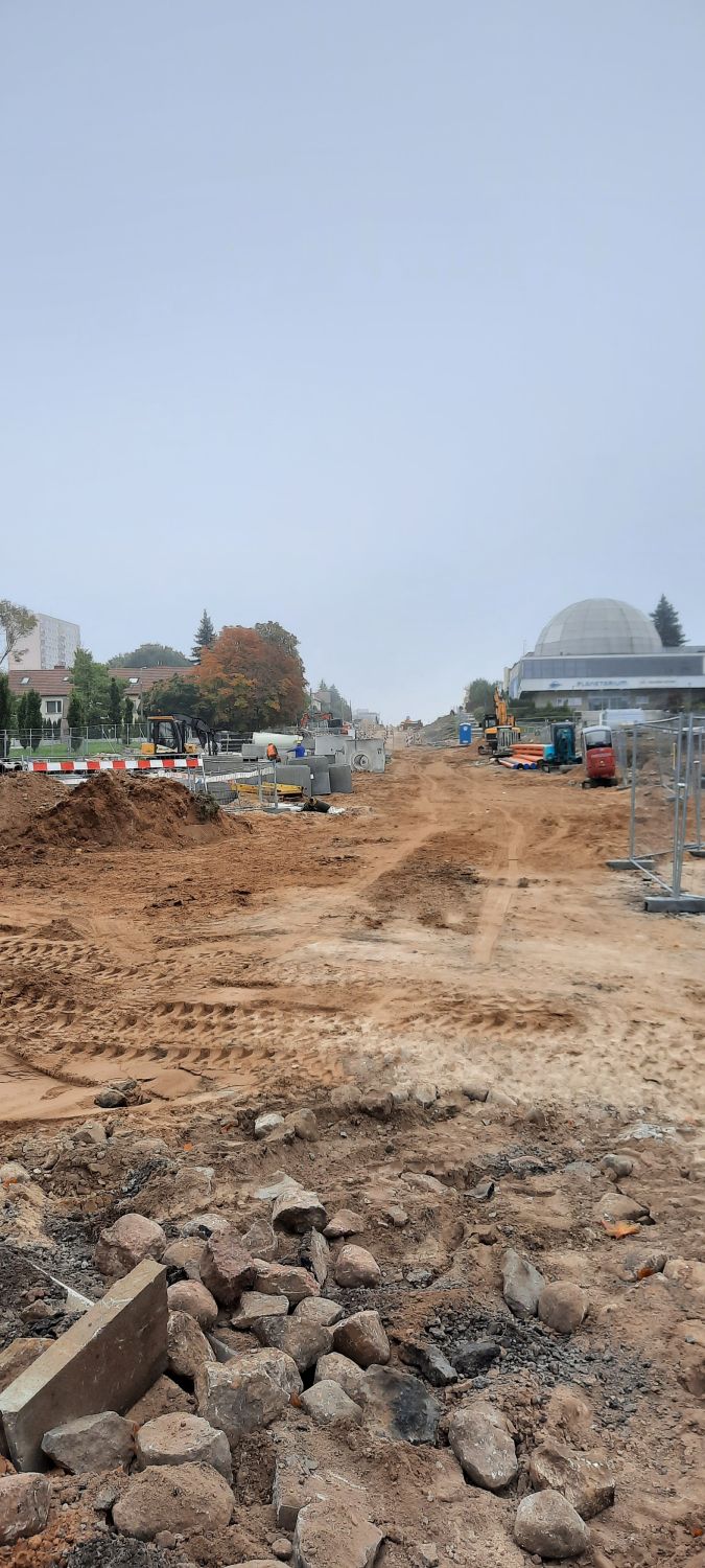 Budowa linii tramwajowej w alei Piłsudskiego, w okolicach przystanku Planetarium (2 października 2021) © OlsztyńskieTramwaje.pl