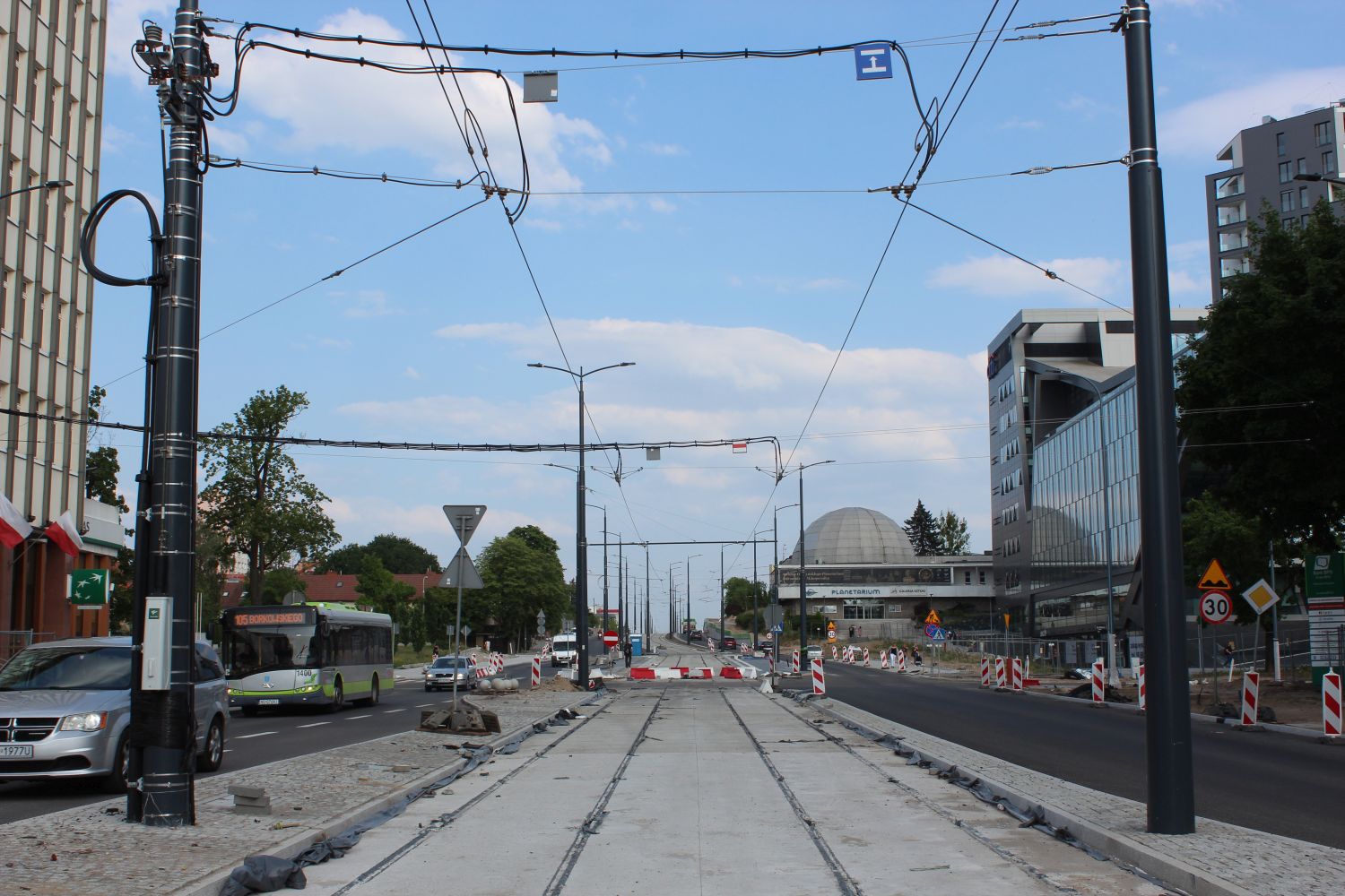 Budowa linii tramwajowej w alei Piłsudskiego, w pobliżu skrzyżowania z ulicą Głowackiego (5 lipca 2023) © OlsztyńskieTramwaje.pl
