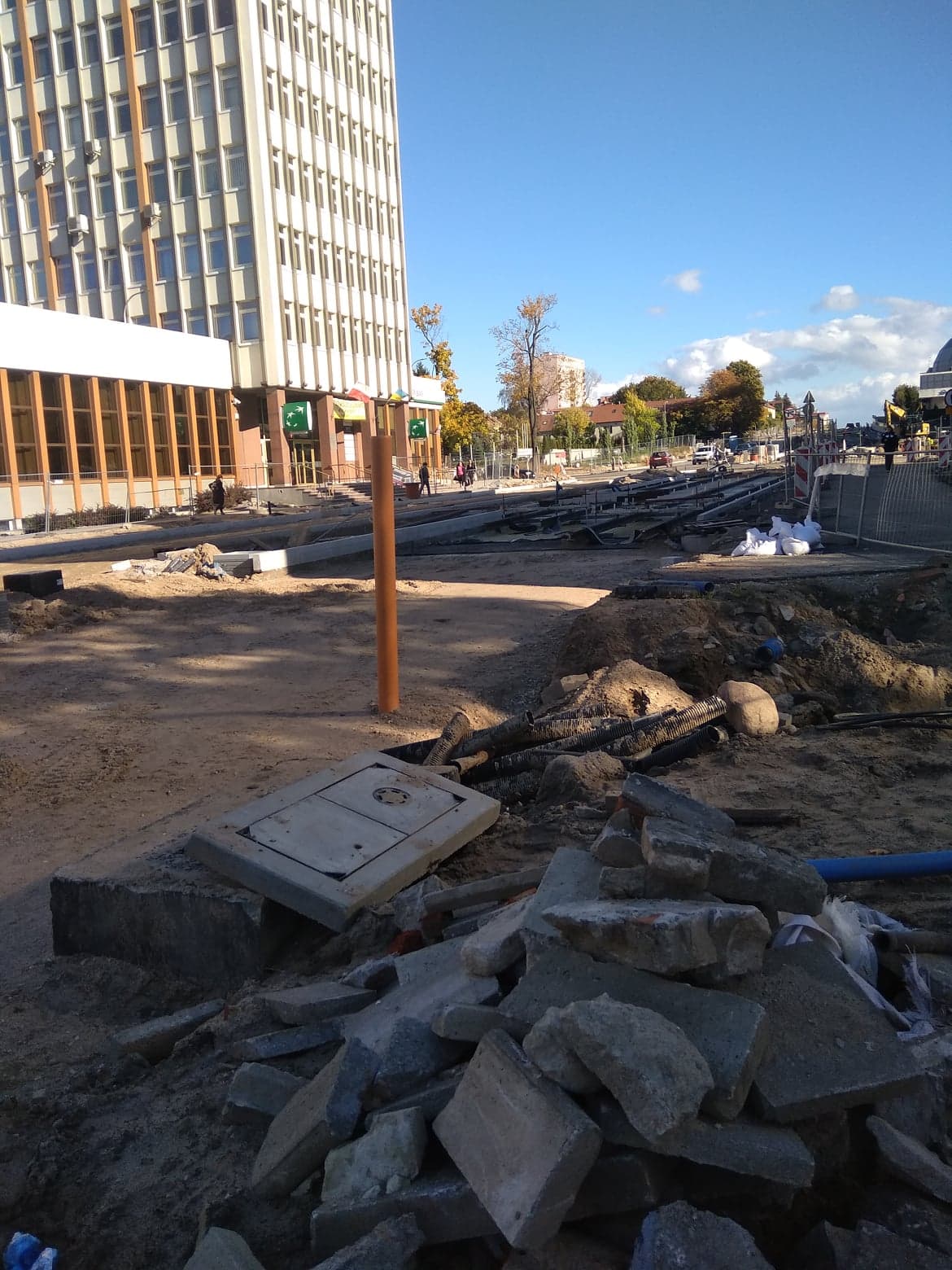 Budowa linii tramwajowej na skrzyżowaniu alei Piłsudskiego i ulicy Kościuszki (6 października 2022) © OlsztyńskieTramwaje.pl