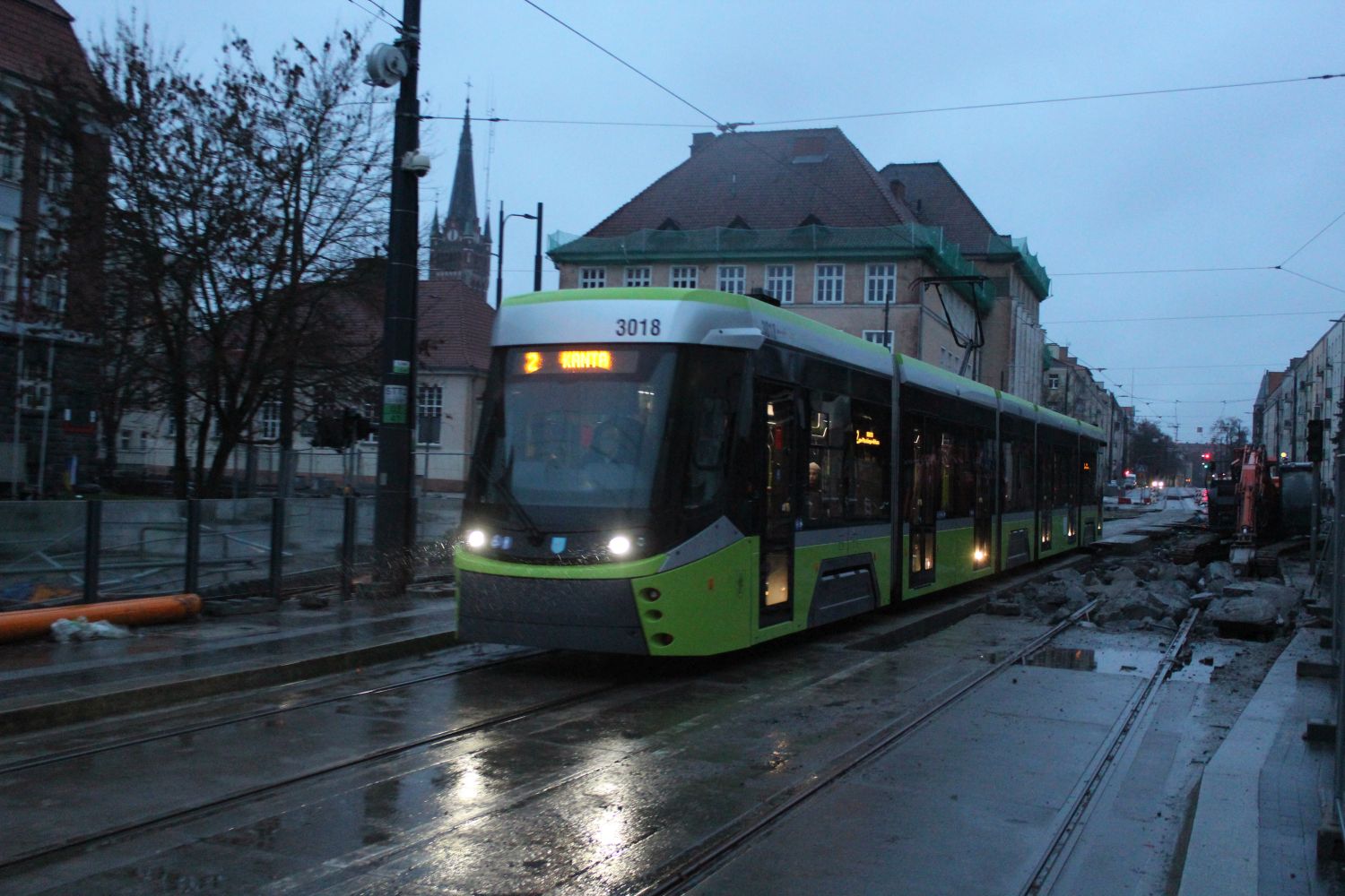 Durmazlar Panorama Olsztyn DRP5H05 #3018 na linii 2 przejeżdża odcinkiem jednotorowym przez budowę linii tramwajowej na skrzyżowaniu ulicy Kościuszki z aleją Piłsudskiego (15 stycznia 2023) © OlsztyńskieTramwaje.pl