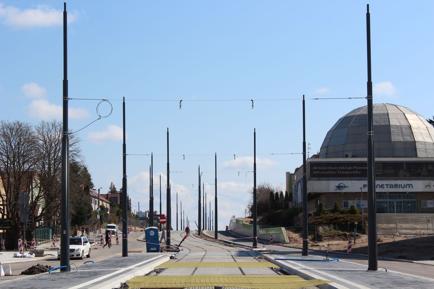 Budowa linii tramwajowej w alei Piłsudskiego, w pobliżu przystanku Planetarium (10 kwietnia 2023) © OlsztyńskieTramwaje.pl