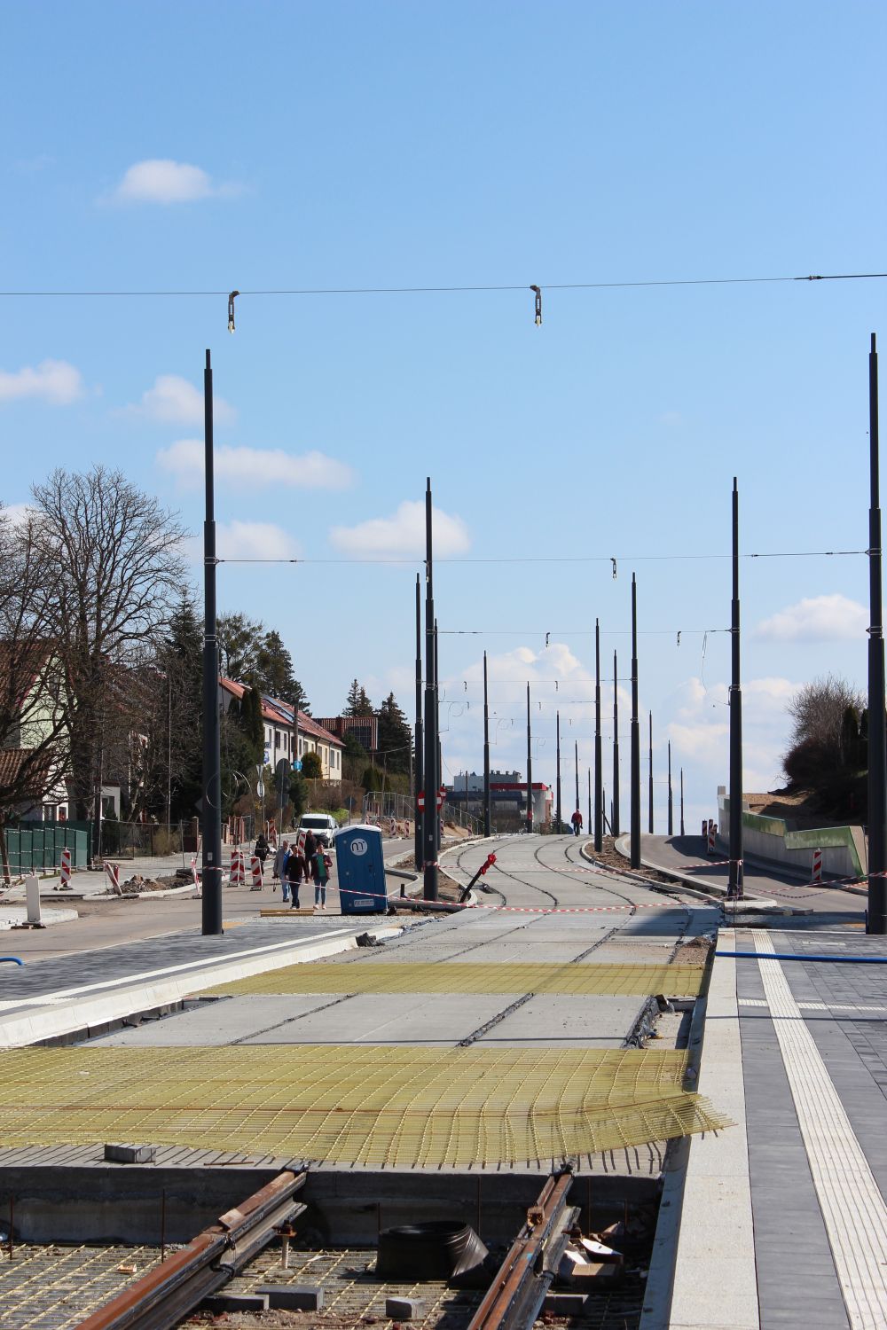 Budowa linii tramwajowej w alei Piłsudskiego, w pobliżu przystanku Planetarium (10 kwietnia 2023) © OlsztyńskieTramwaje.pl