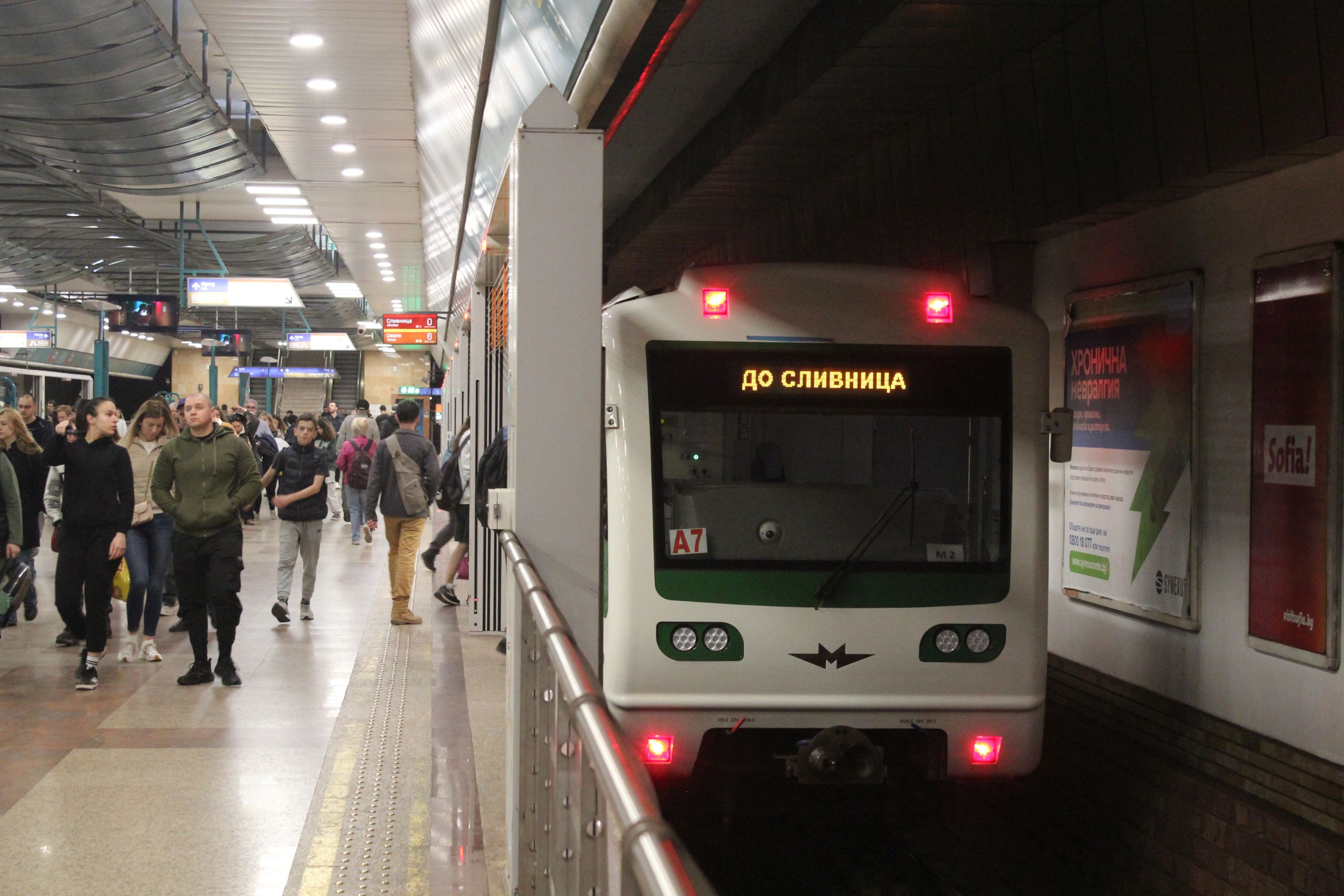 Pociąg metra Metrowagonmasz serii 81 na stacji linii M1 i M4 Serdika (Сердика) w Sofii (24 marca 2024) © OlsztyńskieTramwaje.pl