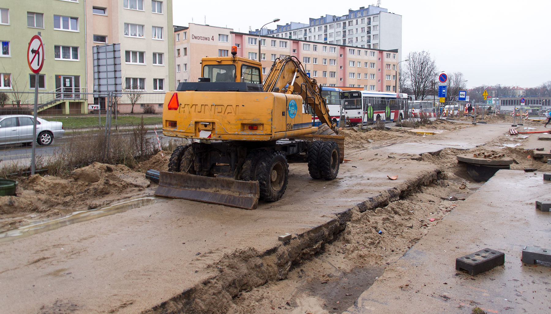 Budowa linii tramwajowej przy ulicy Dworcowej (2 stycznia 2015)