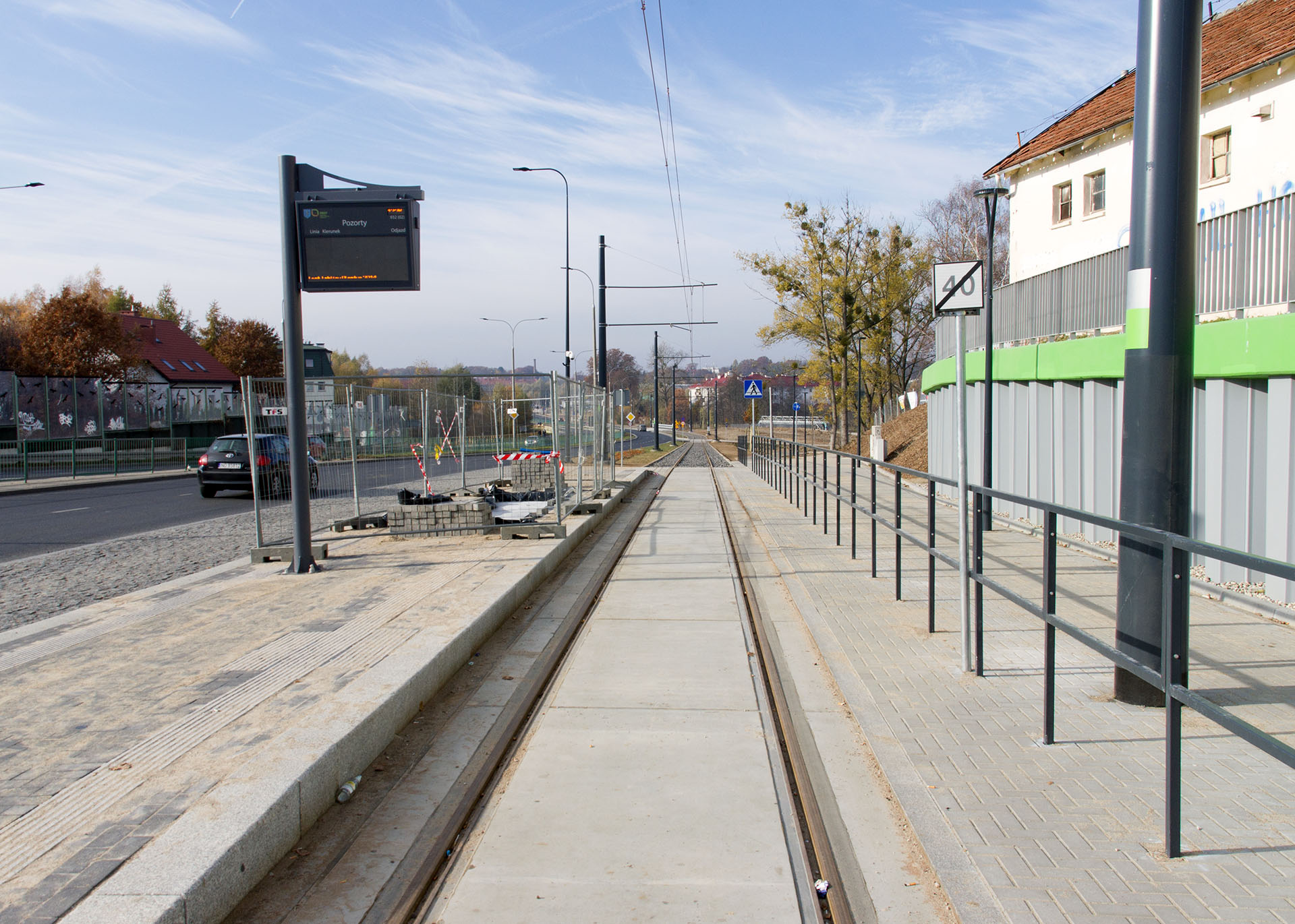 Linia tramwajowa przy ulicy Tuwima (31 października 2015) – przystanek Pozorty