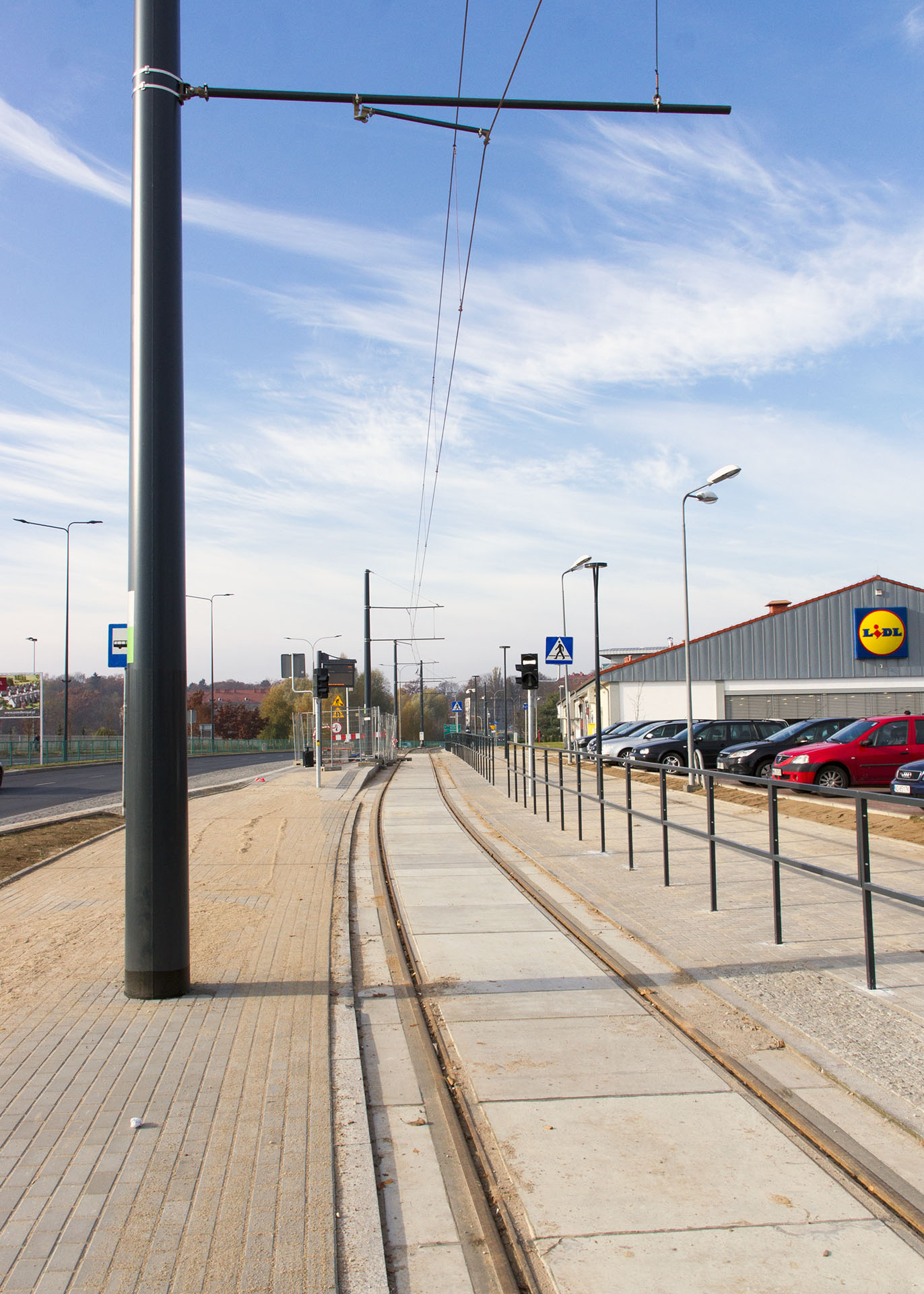 Linia tramwajowa przy ulicy Tuwima (31 października 2015) – przystanek Uniwersytet-Pływalnia