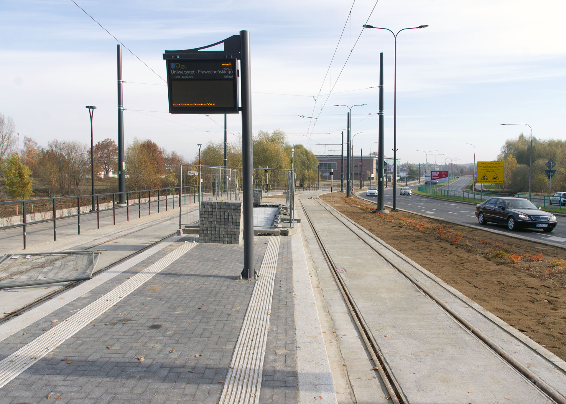 Linia tramwajowa przy ulicy Tuwima (31 października 2015) – przystanek końcowy Uniwersytet-Prawocheńskiego