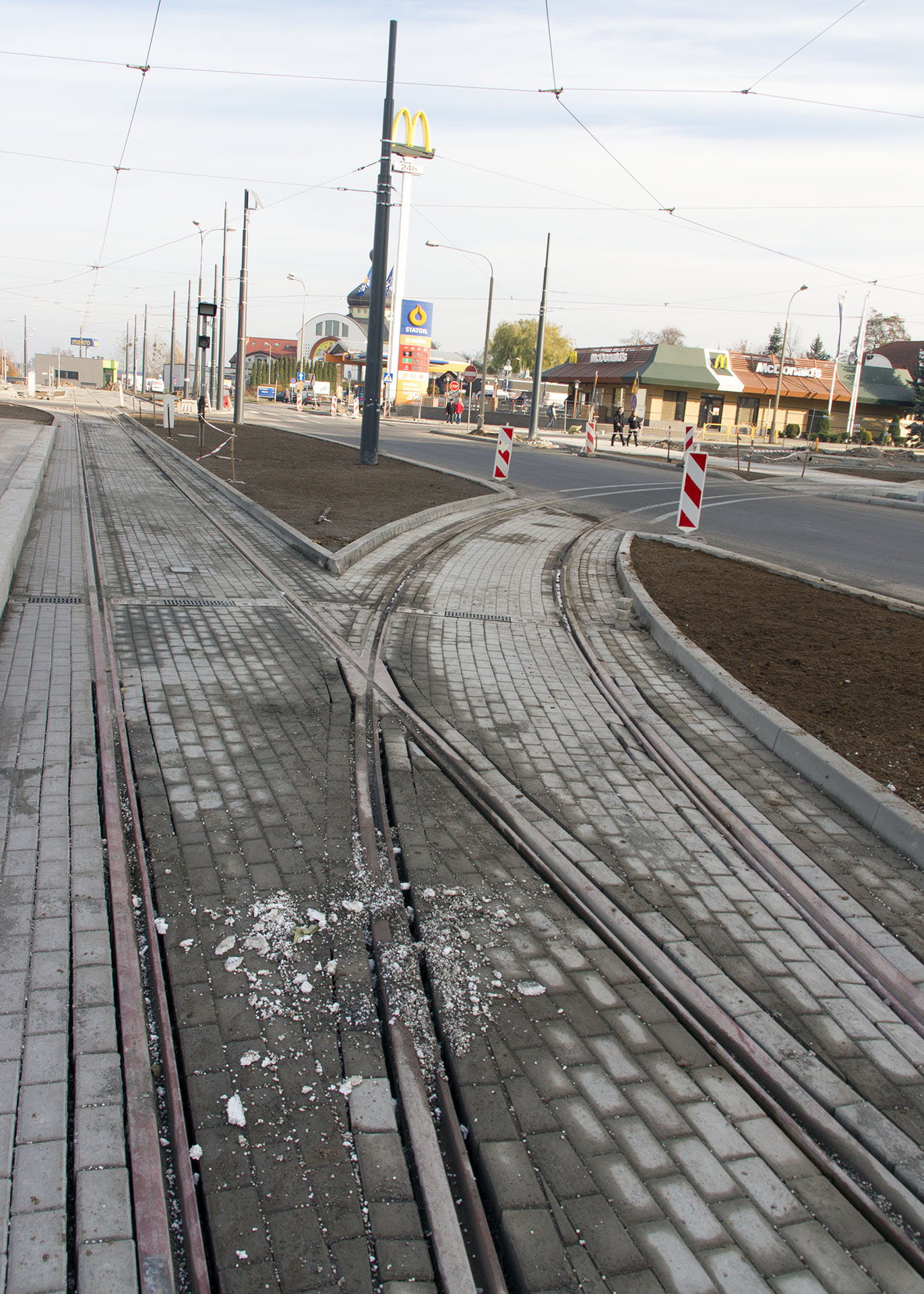 Linia tramwajowa na placu Konstytucji 3 Maja (31 października 2015) – zjazd na tor techniczny do zajezdni