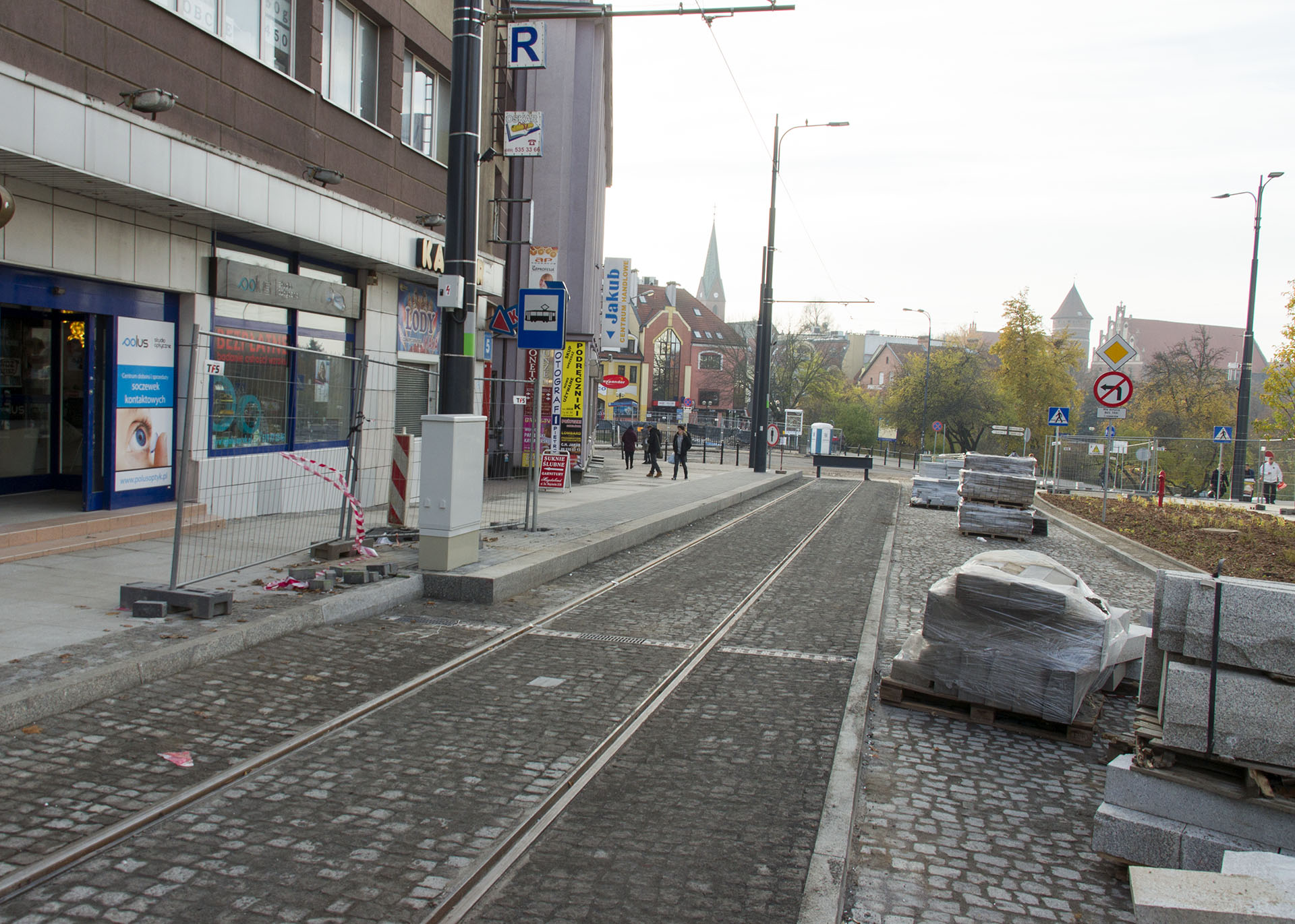 Linia tramwajowa w ulicy 11 Listopada (31 października 2015) – przystanek końcowy Wysoka Brama