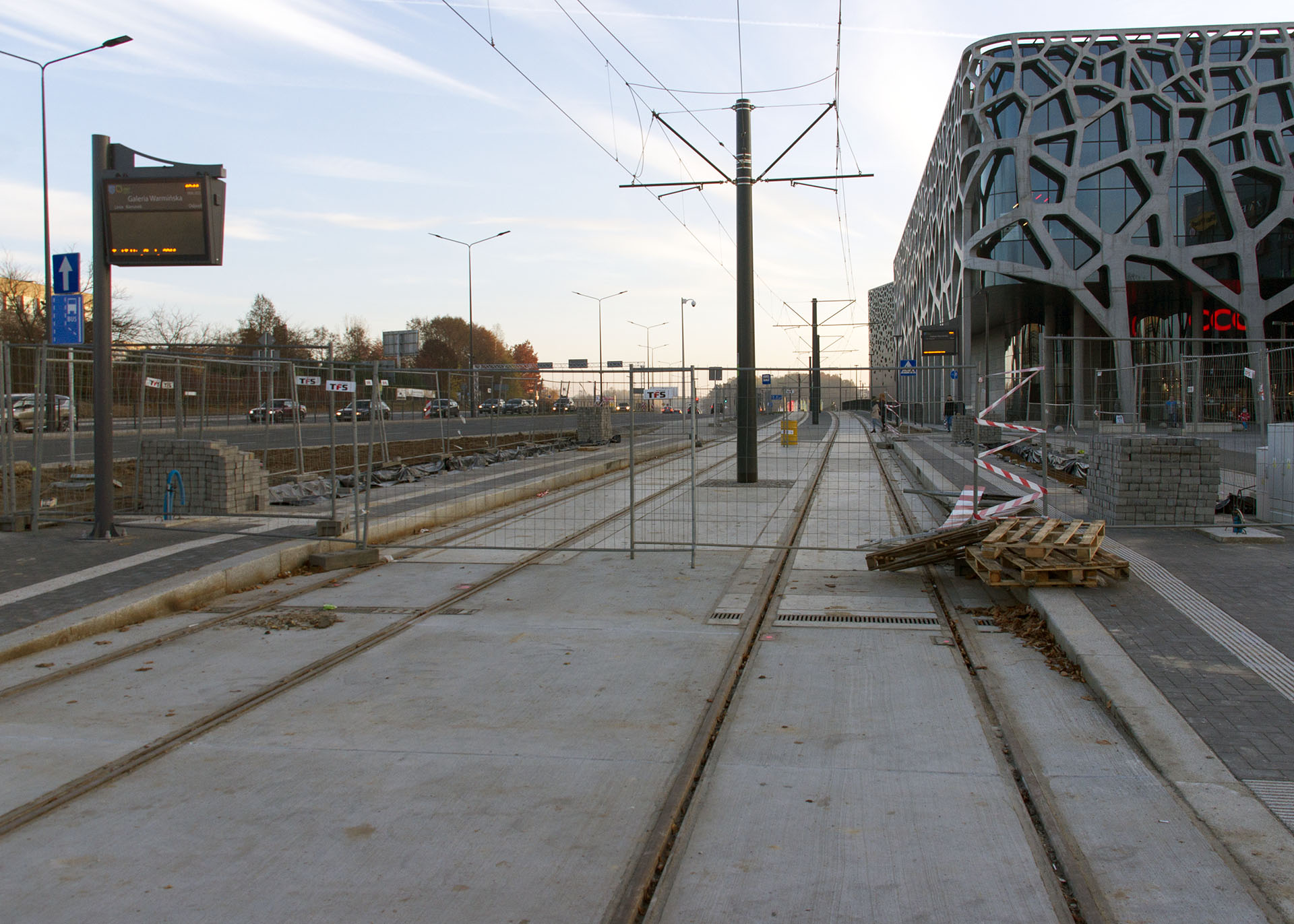 Linia tramwajowa przy alei Sikorskiego (31 października 2015) – przystanek Galeria Warmińska