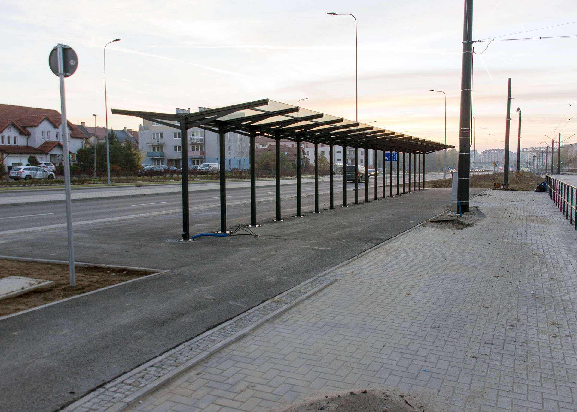 Linia tramwajowa przy ulicy Witosa (31 października 2015) – wiata dla rowerów przy przystanku końcowym Kanta