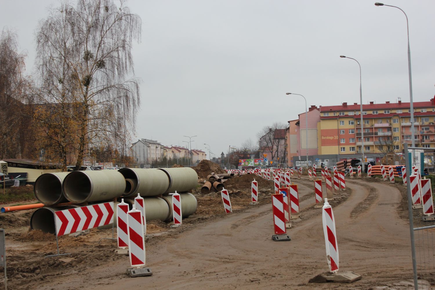 Budowa linii tramwajowej w ulicy Wilczyńskiego, w okolicach skrzyżowania z ulicą Jeziołowicza (14 listopada 2021) © OlsztyńskieTramwaje.pl