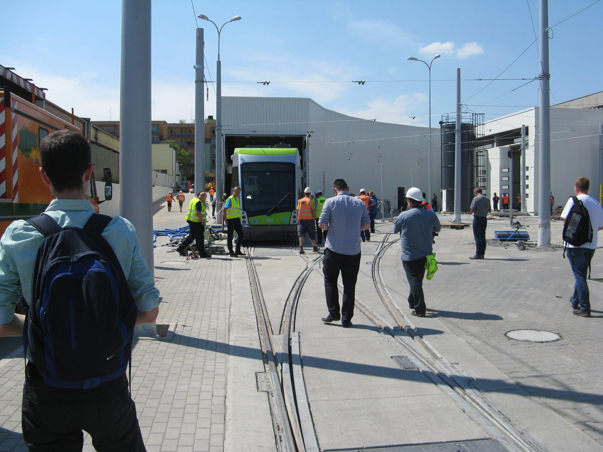 Solaris Tramino Olsztyn #3001 wciągany do hali postojowej zajezdni tramwajowej (12 czerwca 2015) Fot. Kenez