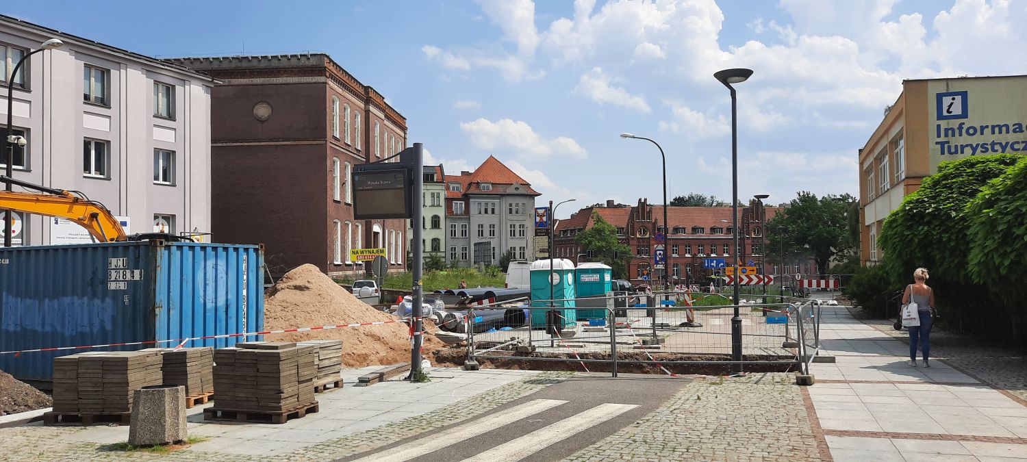 Przygotowania do budowy torowiska i nowego przystanku końcowego Wysoka Brama na placu Jedności Słowiańskiej (1 lipca 2022) © OlsztyńskieTramwaje.pl