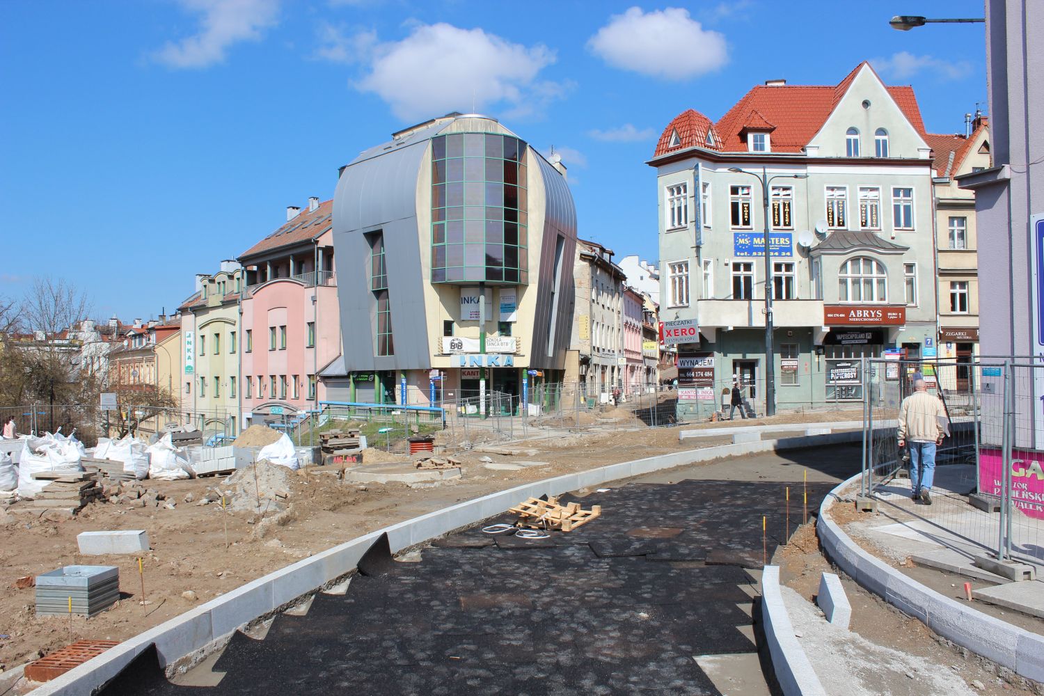 Budowa linii tramwajowej na skrzyżowaniu ulic 11 Listopada, Skłodowskiej-Curie, Nowowiejskiego i Staromiejskiej oraz placu Jedności Słowiańskiej (10 kwietnia 2023) © OlsztyńskieTramwaje.pl