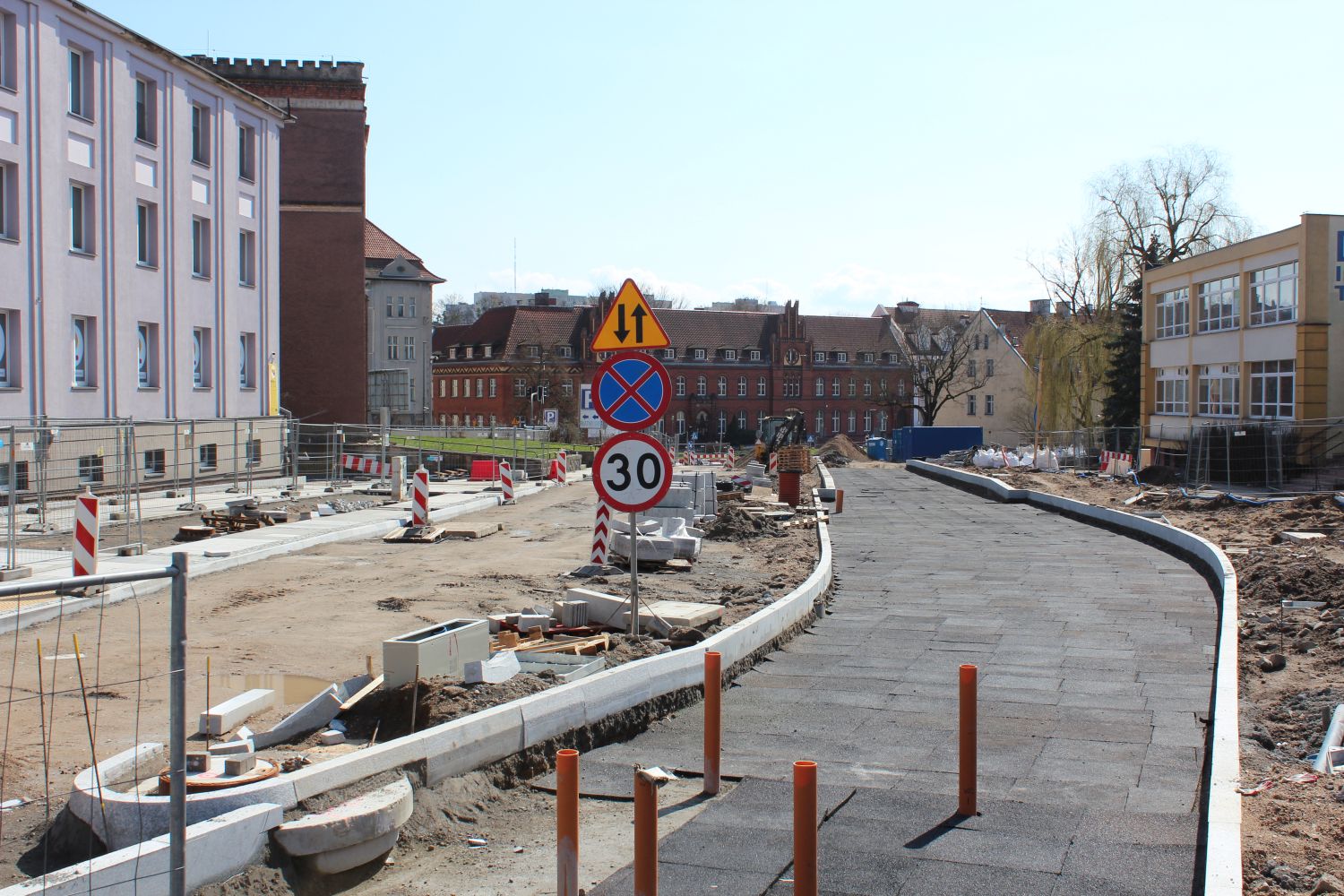 Budowa linii tramwajowej na placu Jedności Słowiańskiej – miejsce nowego przystanku końcowego Wysoka Brama (10 kwietnia 2023) © OlsztyńskieTramwaje.pl