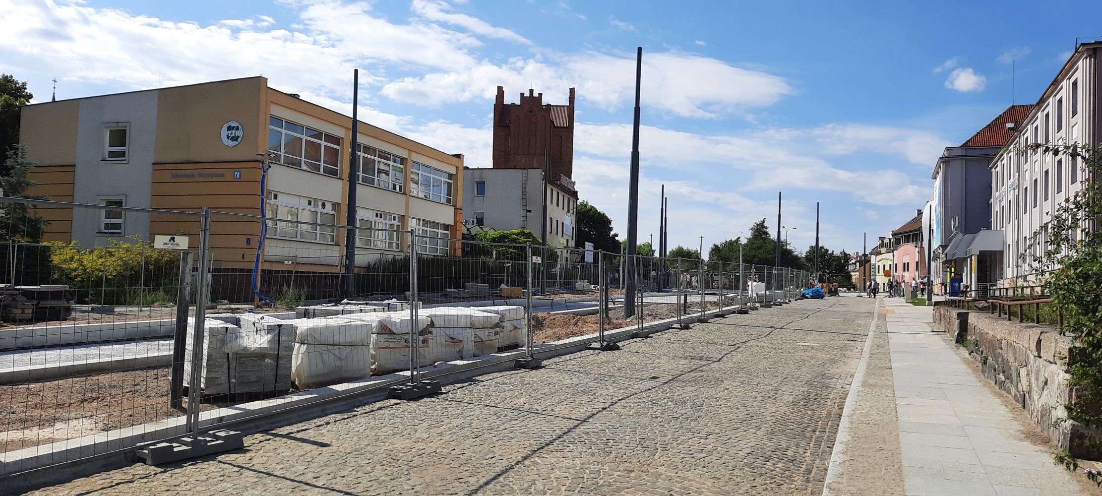 Budowa linii tramwajowej na placu Jedności Słowiańskiej – przystanek końcowy Wysoka Brama (29 lipca 2023) © OlsztyńskieTramwaje.pl