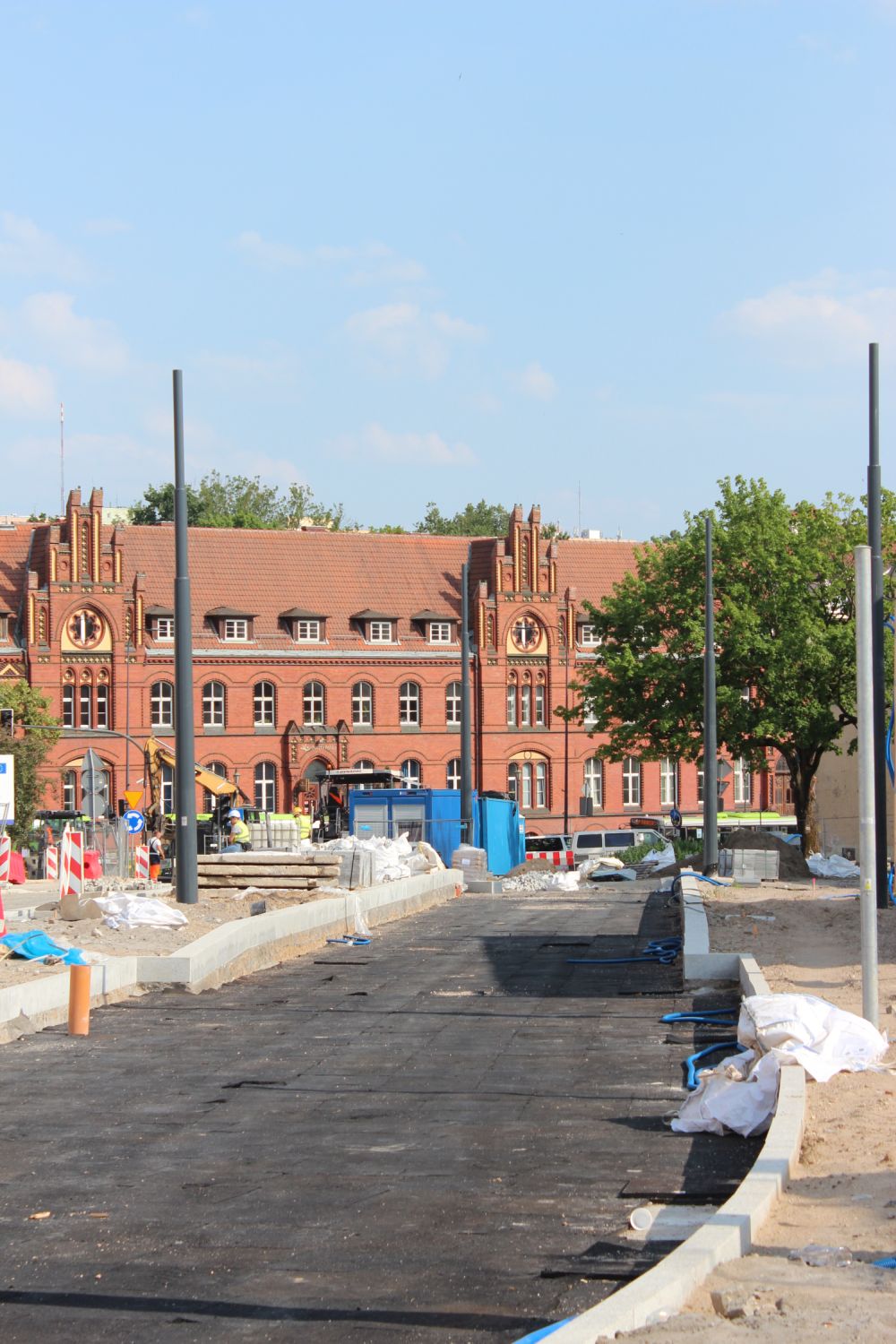 Budowa linii tramwajowej na placu Jedności Słowiańskiej – przystanek końcowy Wysoka Brama (5 lipca 2023) © OlsztyńskieTramwaje.pl