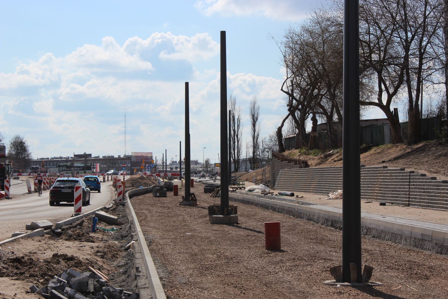 Budowa linii tramwajowej w ulicy Wyszyńskiego, między ulicami Żołnierską i Augustowską a Pstrowskiego (10 kwietnia 2023) © OlsztyńskieTramwaje.pl