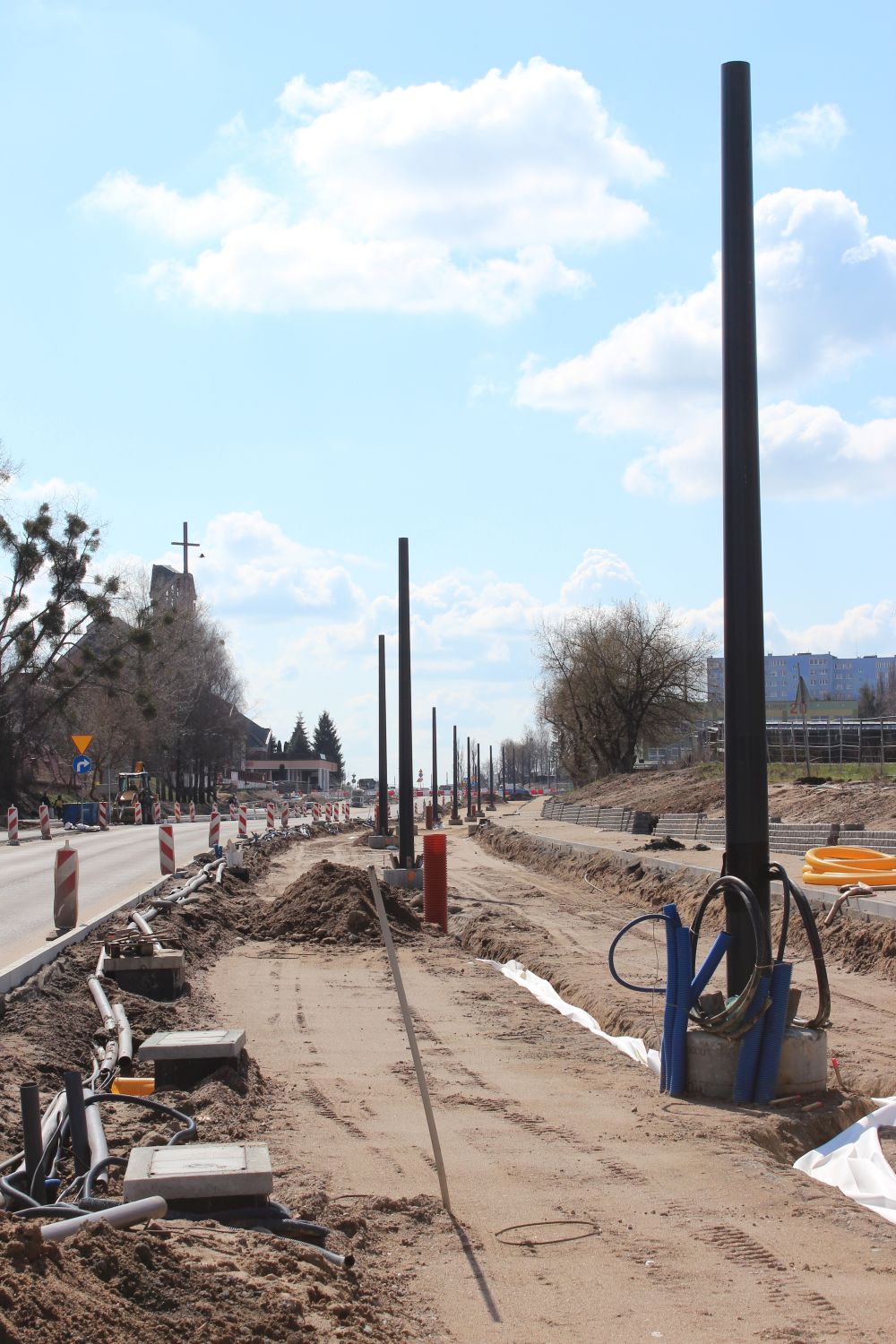 Budowa linii tramwajowej w ulicy Wyszyńskiego, w pobliżu podstacji trakcyjnej (10 kwietnia 2023) © OlsztyńskieTramwaje.pl