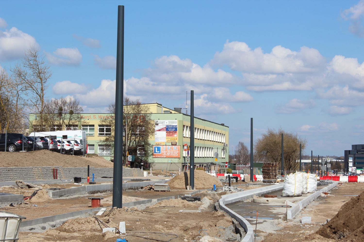 Budowa linii tramwajowej w ulicy Wyszyńskiego, w pobliżu skrzyżowania z ulicami Żołnierską i Augustowską (10 kwietnia 2023) © OlsztyńskieTramwaje.pl