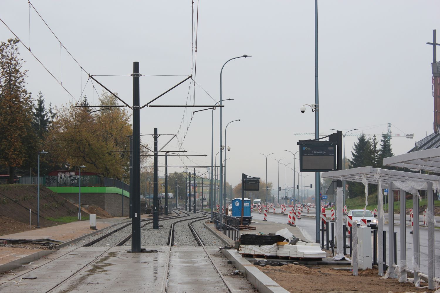 Budowa linii tramwajowej w ulicy Wyszyńskiego – przystanek Pstrowskiego (22 października 2023) © OlsztyńskieTramwaje.pl